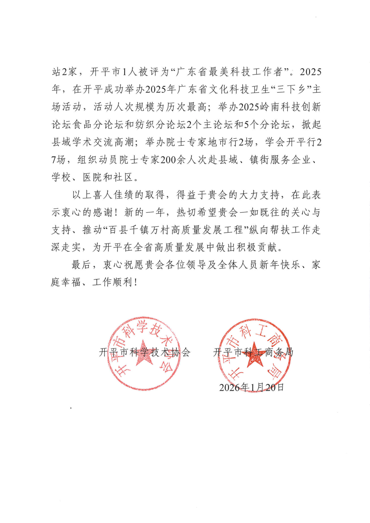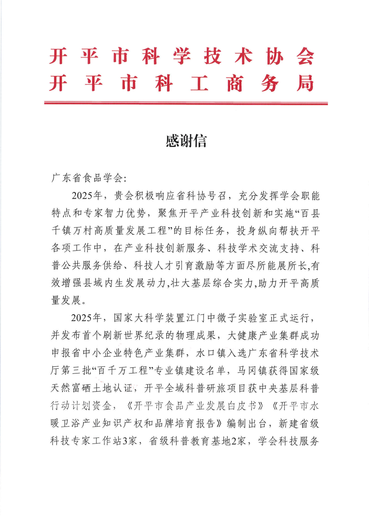 这封感谢信不仅是一份荣誉,更是一份责任与期许。新的一年,广东省食品学会将继续秉承服务科技、服务产业、服务社会的宗旨,紧密依托专家资源和组织优势,持续深化与开平市等地区的合作,推动“百千万工程”纵向帮扶工作走深走实,努力在促进产学研用融合、提升全民科学素质、服务地方经济高质量发展中展现新作为、贡献新力量!