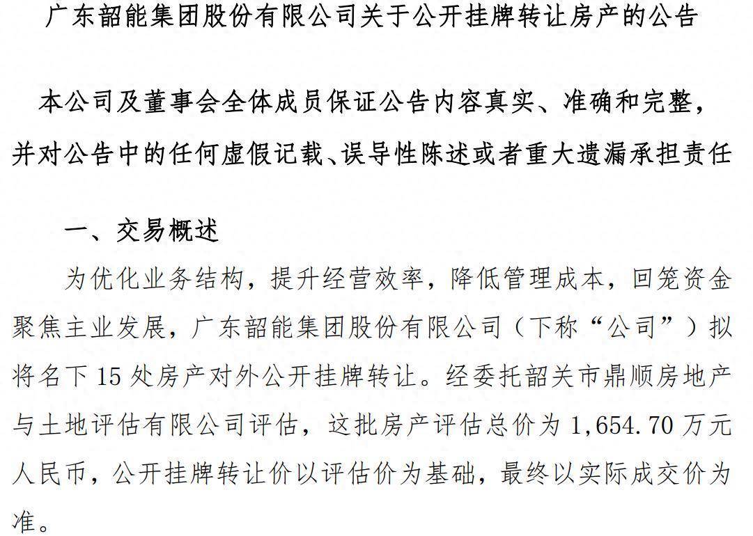 12月5日晚间,韶能股份(000601)发布公告称,为优化业务结构,提升经营效率,降低管理成本,回笼资金聚焦主业发展,公司拟将名下15处房产对外公开挂牌转让。经韶关市鼎顺房地产与土地评估有限公司评估,这批房产评估总价为1654.70万元,公开挂牌转让价以评估价为基础股票股票配资,最终以实际成交价为准。